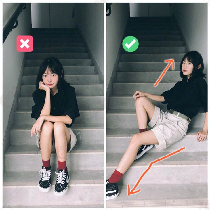 Với background là cầu thang, bạn cần tránh tuyệt đối kiểu ngồi để hai chân chụm lại trên cùng một bậc vì sẽ khiến hình thể không được tự nhiên và dễ lộ khuyết điểm. Thay vào đó, bạn nên đặt mỗi chân tại một bậc cầu thang khác nhau, đầu gối co lại góc 135 độ. Với cách tạo dáng như vậy, chân bạn sẽ trông dài và thon hơn, tạo hiệu ứng đánh lừa thị giác người nhìn.